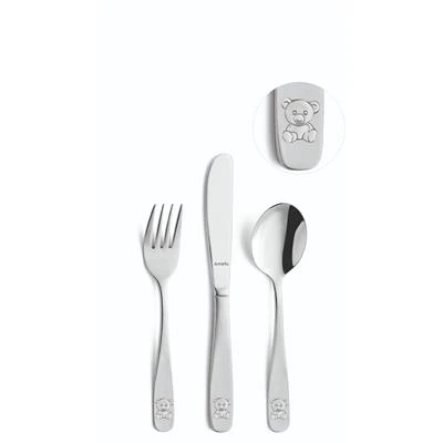Deze 3-delige bestekset van Amefa is speciaal gemaakt voor kinderen vanaf 3 jaar. De set bestaat uit een vork, mes en lepel, met een vrolijke beer op het handvat. De normaal scherpe delen van het mes en de vork zijn afgerond, zodat ze veilig te gebruiken zijn voor kinderen. Elk kind zal met deze set trots zijn op het eigen bestek en met plezier leren om zelf met bestek te eten. Het bestek heeft een hoogglans afwerking en is vaatwasmachinebestendig.