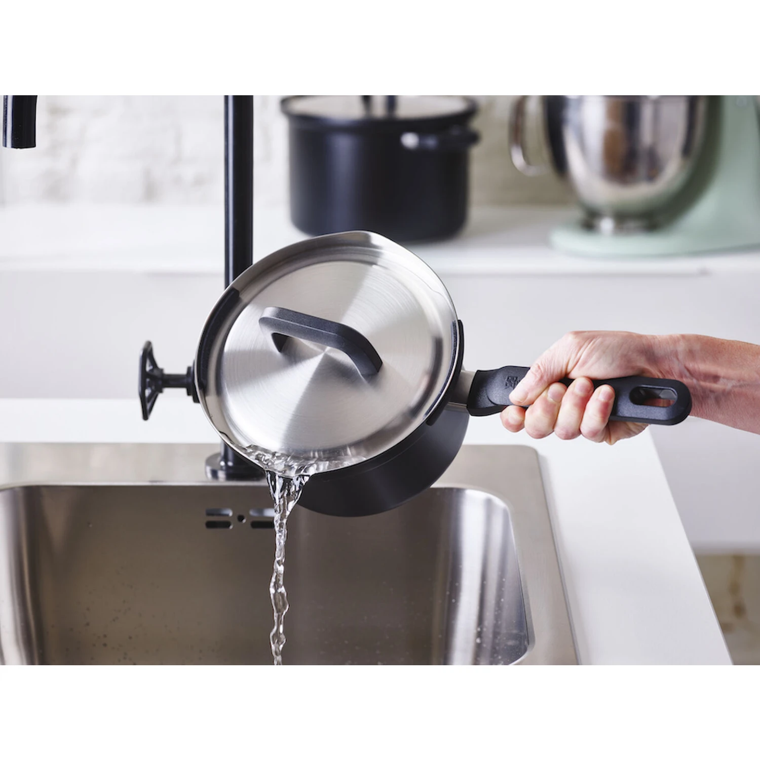 - Uniek afgietsysteem. Met een simpele kwartslag draai, vergrendeld de deksel onder de zwarte siliconen stoppers