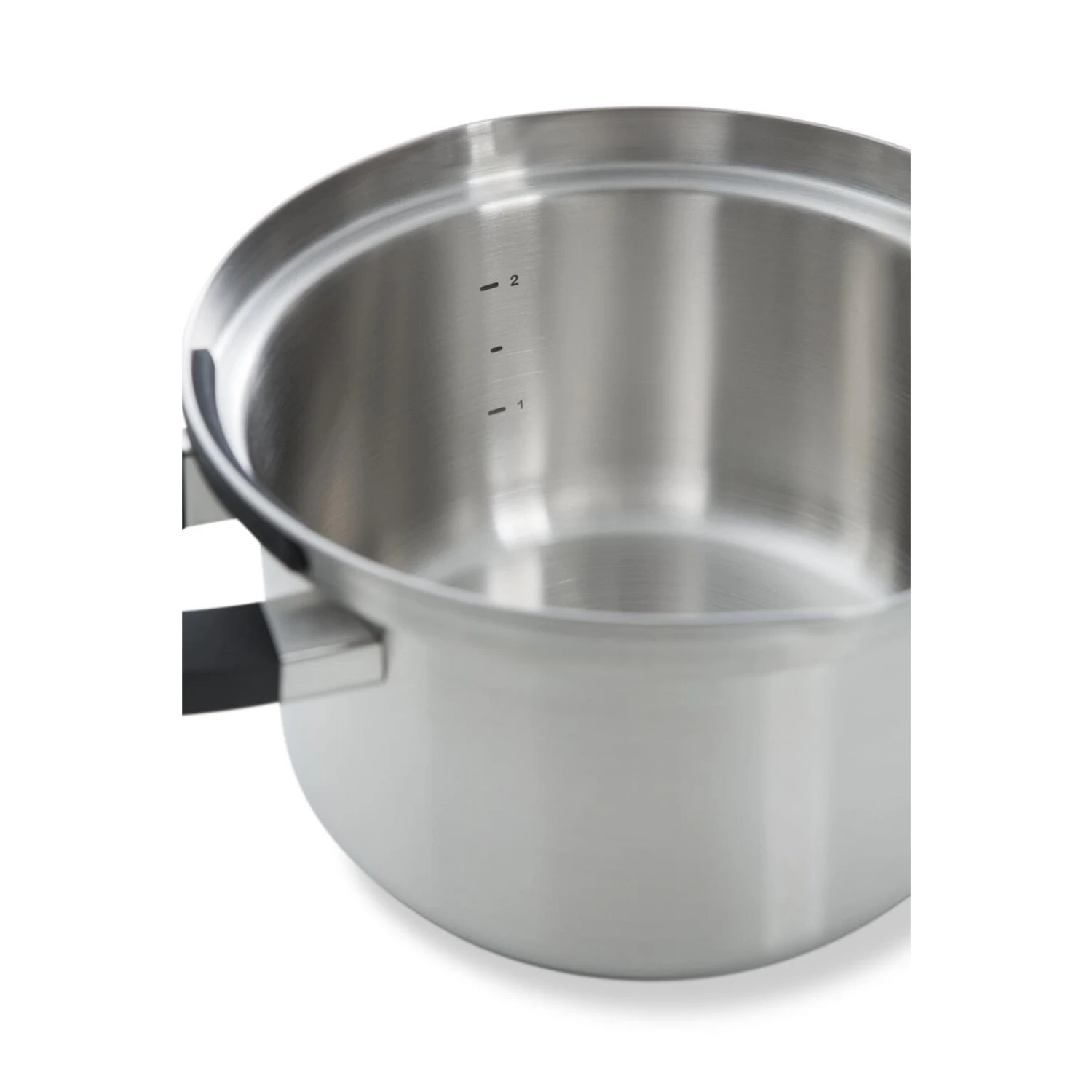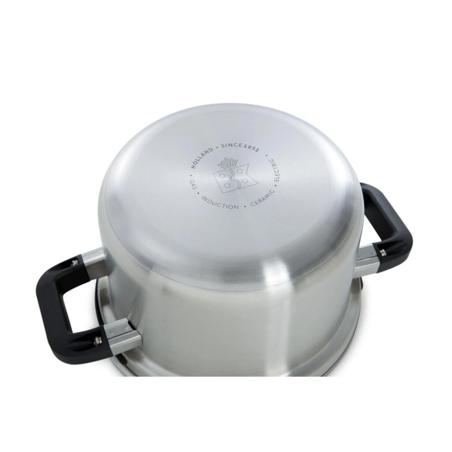 Een stoere rvs pannenset van BK. De BK Flow Cool pannenset is vier delig en bestaat uit 3 kookpannen met deksel en een steelpan met deksel. De BK Flow Cool kookpannen zijn voorzien van een veilig en uniek afgietsysteem. Met een simpele kwartslag draai, vergrendeld de deksel onder de zwarte siliconen stoppers. Zo kun je op een veilige manier met twee handen afgieten.Â