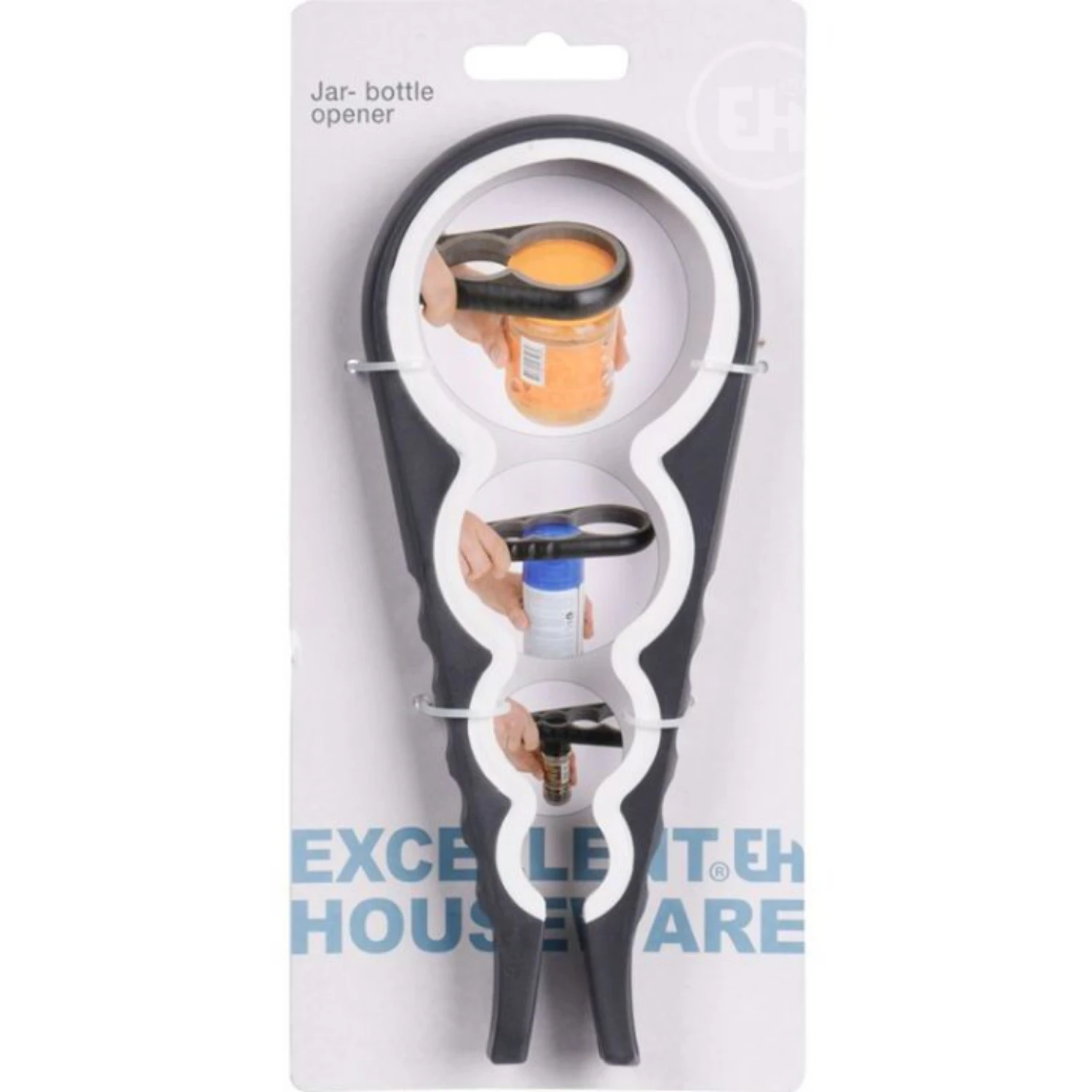Met de Excellent Houseware 4-in-1 opener open je gemakkelijk flessen en potten van verschillende formaten. De rubberen strip aan de binnenzijde zorgt voor een stevige grip. Zet de opener op de deksel en draai hem eenvoudig open zonder veel kracht te gebruiken. Er zijn 2 kleurvarianten verkrijgbaar: blauw en wit.