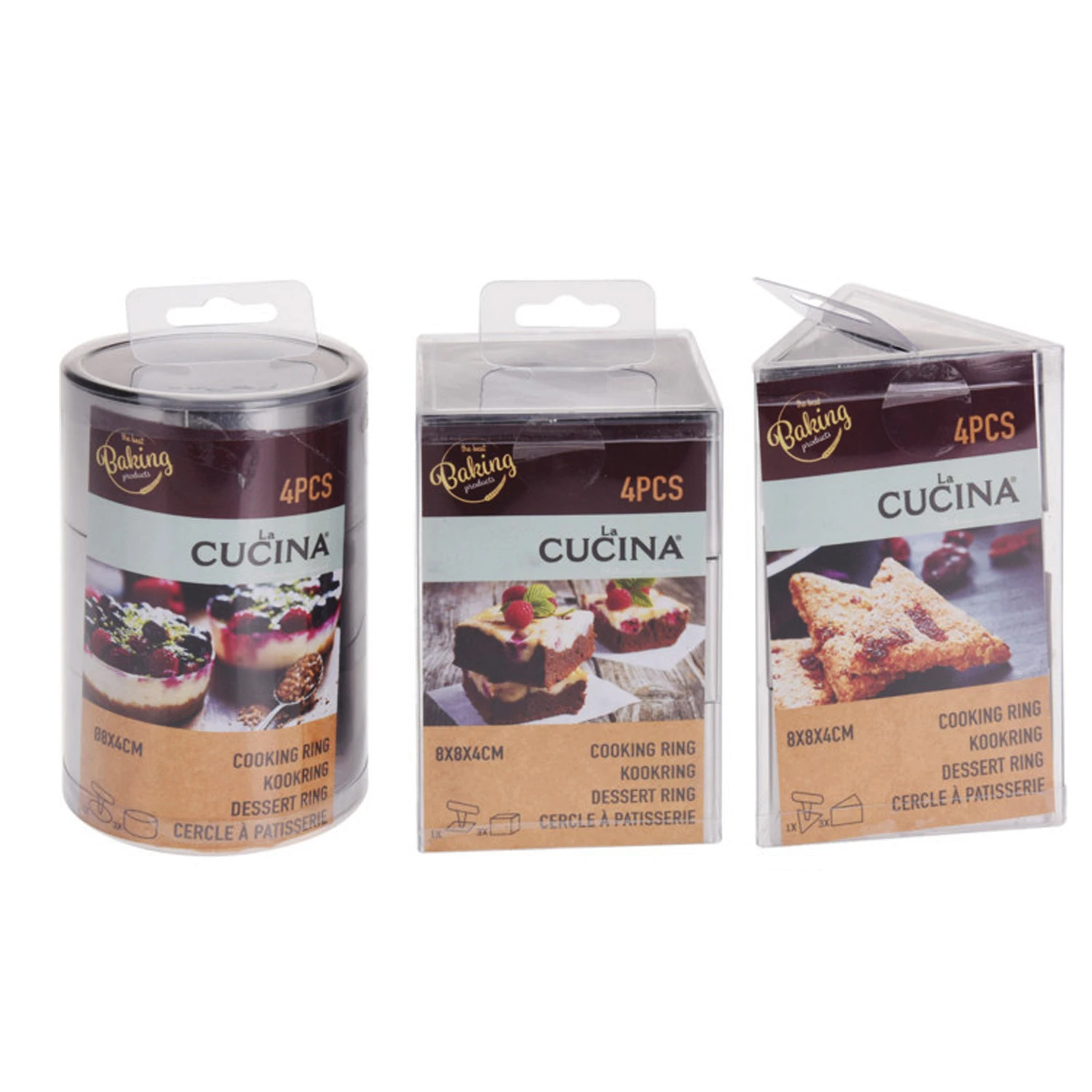 Deze 4-delige set bakringen is ideaal voor het serveren van maaltijden tijdens ontbijt, lunch, brunch en diner. Plaats bijvoorbeeld rijst in de vorm en duw hem aan met de deksel. Of bak er kleine cakejes in voor een mooie ronde, vierkante of driehoekige vorm. Na gebruik mogen de vormen in de vaatwasser. De set bestaat uit 3 ringen en 1 deksel. Het artikel is een assorti van 3 verschillende vormen. Het is een verrassing welke je ontvangt.